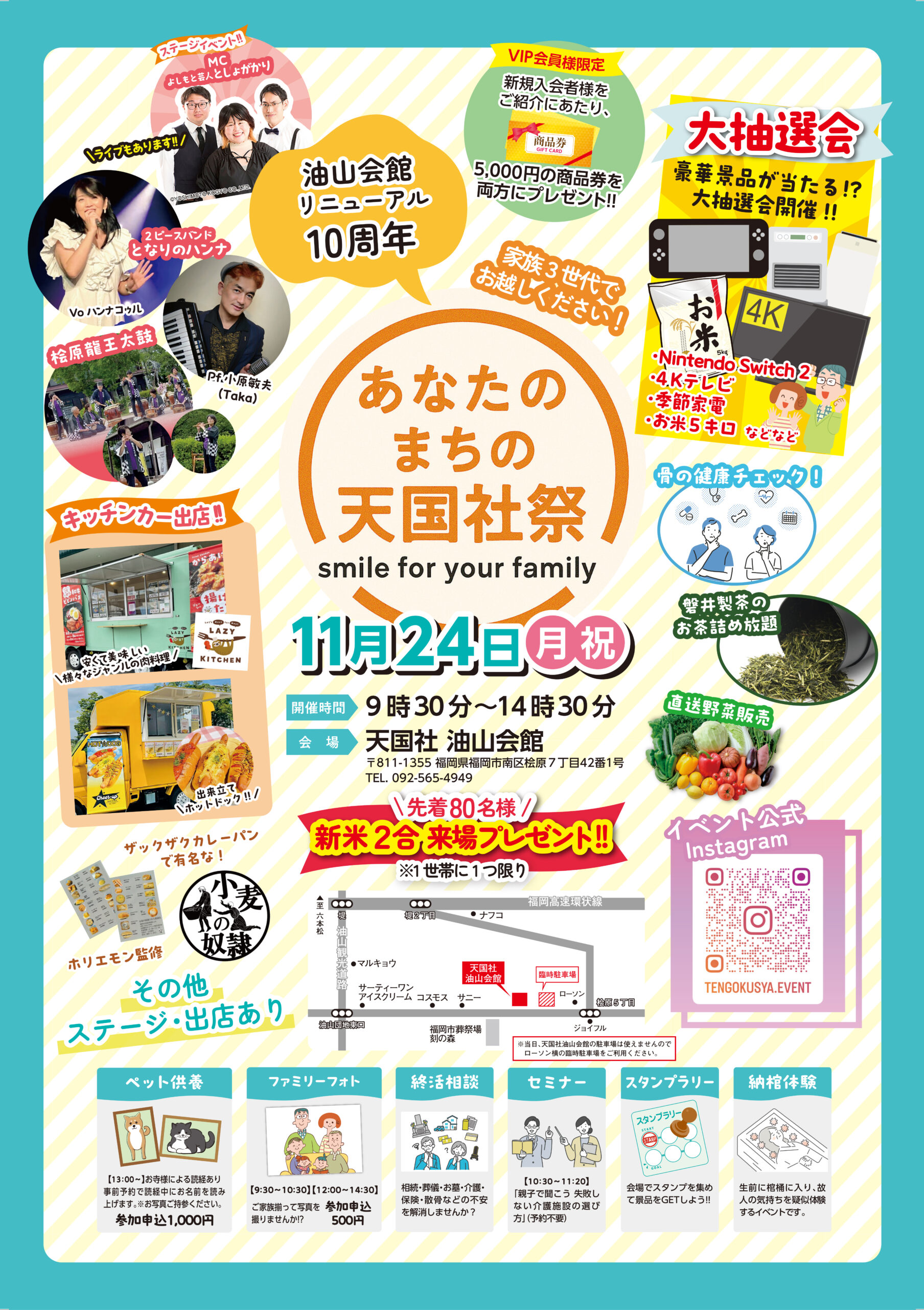 天国社からのお知らせ 福岡の葬儀社「天国社」 天国社からのお知らせ イベント情報 あなたのまちの天国社祭 開催 あなたのまちの天国社祭 開催 2025.10.24 イベント情報 油山会館がリニューアルオープンして今年で10周年を迎えます。 今回は、このリニューアルオープン10周年を記念して油山会館で「あなたのまちの天国社祭」を開催致します。 今年、会場を盛り上げてくれるMCの方はなんと、よしもと芸人としょがかりさん! また、2ピースバンドとなりのハンナさんや、桧原龍王太鼓さんなどのステージイベントもありますよ! さらに、ペット供養・ファミリーフォト・スタンプラリー・納棺体験など、体験型イベントも盛りだくさん 会場には直送野菜販売や磐井製茶のお茶の詰め放題、キッチンカーも出店します! 「あなたのまちの天国社祭」ビックイベント豪華景品が当たる大抽選会もあります! 日にち:11月24日 (月祝)開催時間:9時30分~14時30分まで 先着80名様に 新米2合 来場プレゼント!!※1世帯に1つ限り 当日、お車でお越しの方は油山会館の駐車場は使用できませんので、ローソン横の臨時駐車場をご利用ください。※駐車可能台数に限りがありますので、お気を付けください 些細と思われる事も、お気軽にご連絡ください。 24時間365日対応・通話無料 電話をかける メールでご相談 無料資料請求 戻る カテゴリー 新着情報 お知らせ イベント情報 葬儀の知識 福岡の葬儀情報 家族葬について お客様の声 ご葬儀事例一覧 年別アーカイブ 2025年 2024年 2023年 2022年 2021年