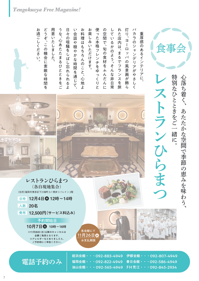 天国社からのお知らせ 福岡の葬儀社「天国社」 天国社からのお知らせ お知らせ レストランひらまつでのお食事会参加者募集 レストランひらまつでのお食事会参加者募集 2025.11.05 お知らせ 12月4日(木)12時~14時博多リバレイン2階にある「レストランひらまつ」にて食事会を行います。 現在、まだ定員に達しておりませんので再度、参加者を募集致します。 旬の食材をふんだんに使った本格フレンチをゆっくりとお楽しみいただけるイベントとなっております! 参加をご希望の方は、電話予約にてお早めにお申し込みください。お電話の際に、アレルギーなどございましたらご申告お願い致します。 ※お支払期限は各会館にて11月26日(水)お支払期限となっております。なお、11月26日(水)以降のキャンセルは全額ご負担となりますのでご注意ください。 些細と思われる事も、お気軽にご連絡ください。 24時間365日対応・通話無料 電話をかける メールでご相談 無料資料請求 戻る カテゴリー 新着情報 お知らせ イベント情報 葬儀の知識 福岡の葬儀情報 家族葬について お客様の声 ご葬儀事例一覧 年別アーカイブ 2025年 2024年 2023年 2022年 2021年