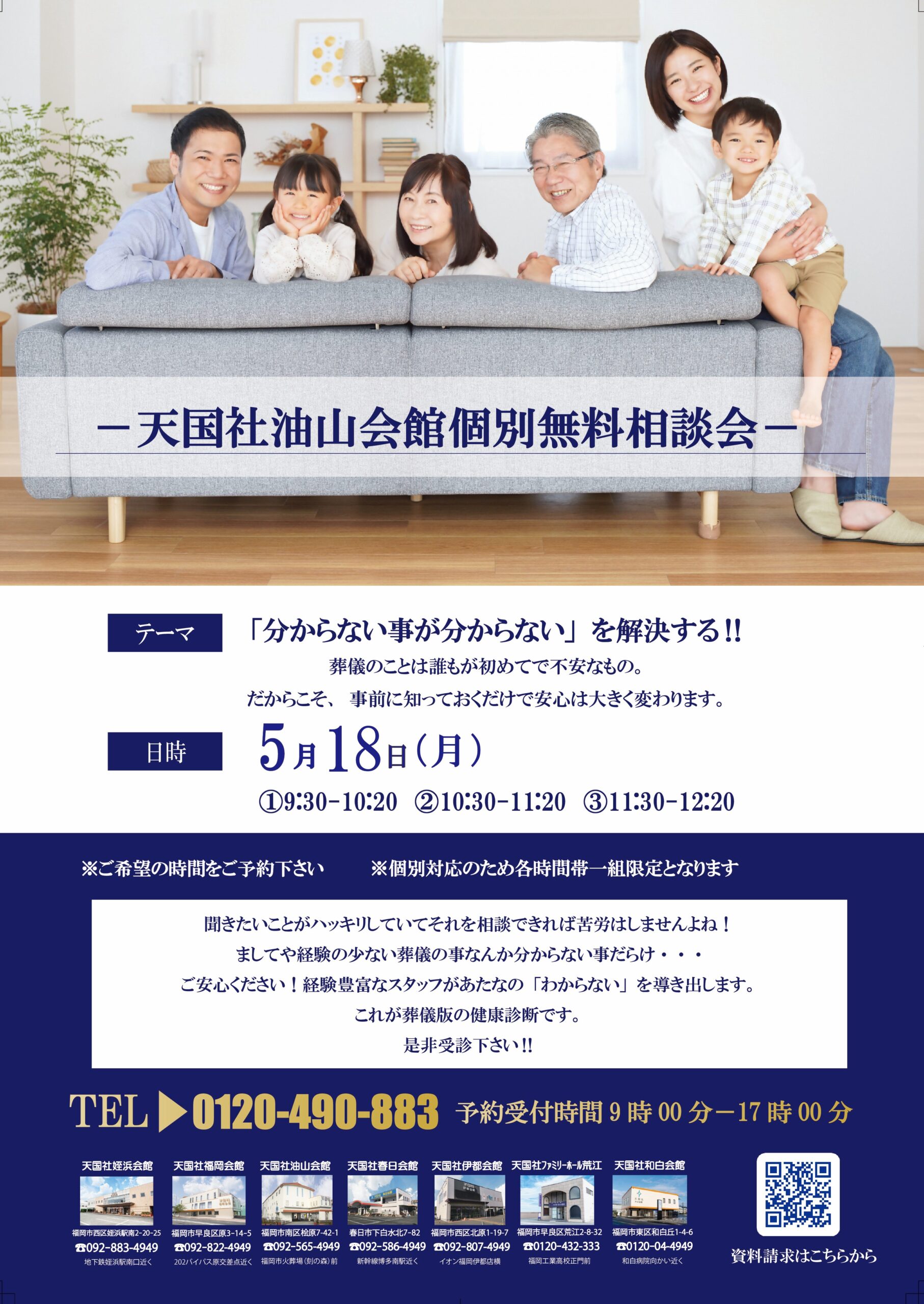天国社からのお知らせ 福岡の葬儀社「天国社」 天国社からのお知らせ お知らせ 天国社油山会館個別無料相談会を開催致します 天国社油山会館個別無料相談会を開催致します 2026.04.18 お知らせ 5月18日(月)に油山会館にて個別無料相談会を開催致します。 テーマは「分からない事が分からない」を解決する!!経験の少ない葬儀の事なんか分からない事だらけ…しかしご安心ください。 経験豊富なスタッフが皆様の「わからない」を導き出します。 時間①9:30~10:20 ②10:30~11:20 ③11:30~12:20 個別相談対応となりますので各時間1組限定となります。 要予約となっておりますので興味がある方はぜひ、お早めにご予約ください。※予約受付時間9時~17時までとなります 些細と思われる事も、お気軽にご連絡ください。 24時間365日対応・通話無料 電話をかける メールでご相談 無料資料請求 戻る カテゴリー 新着情報 お知らせ イベント情報 葬儀の知識 福岡の葬儀情報 家族葬について お客様の声 ご葬儀事例一覧 年別アーカイブ 2026年 2025年 2024年 2023年 2022年 2021年