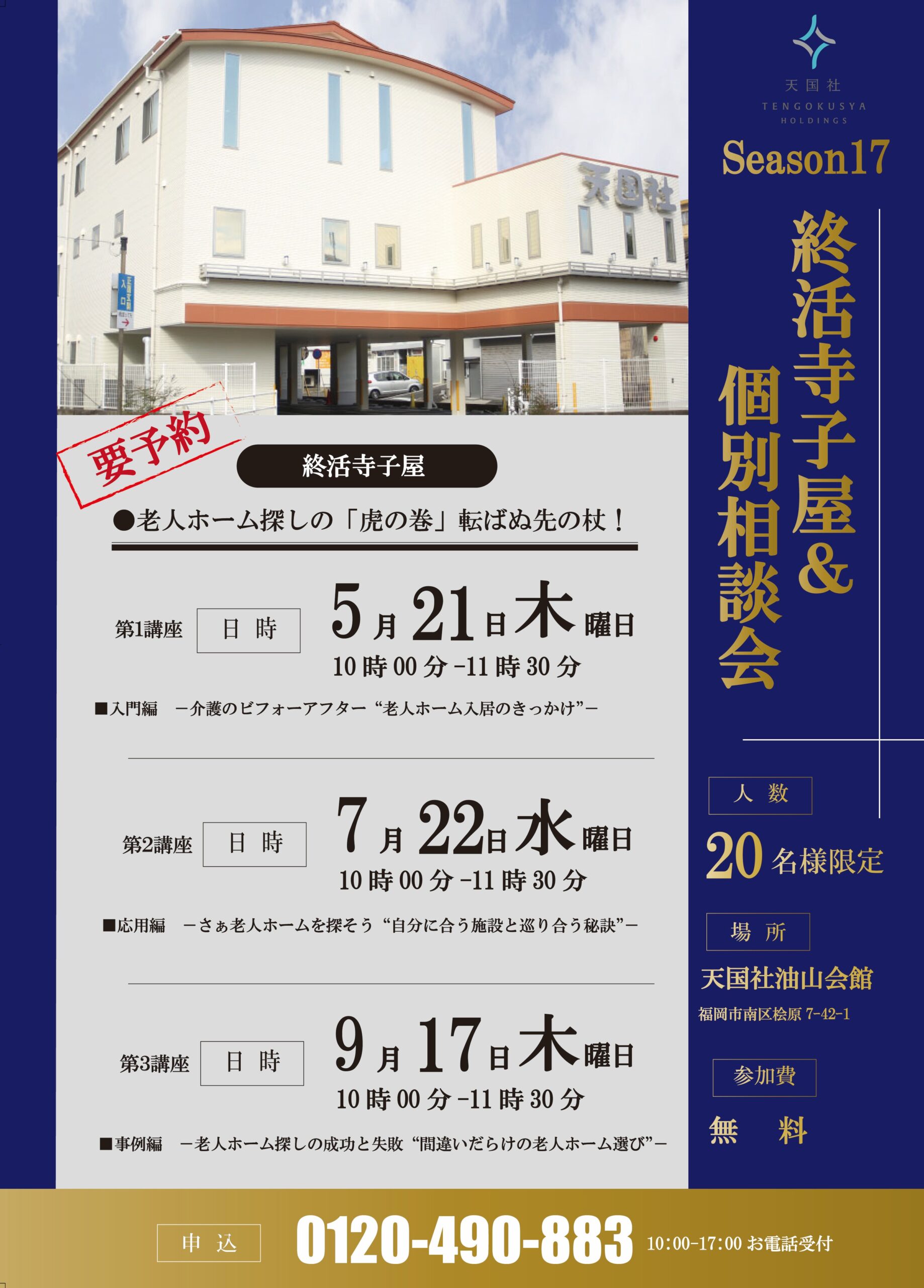 天国社からのお知らせ 福岡の葬儀社「天国社」 天国社からのお知らせ お知らせ 油山会館で終活寺子屋&個別相談会を開催致します 油山会館で終活寺子屋&個別相談会を開催致します 2026.04.21 お知らせ 油山会館にて、終活寺子屋を実施致します。 今回のタイトルは「老人ホーム探しの「虎の巻」転ばぬ先の杖!」 スケジュールはこちら! ◎第1講座 5月21日 木曜日 10時~11時30分 ◇入門編 -介護のビフォーアフター“老人ホーム入居のきっかけ”- ◎第2講座 7月22日水曜日10時~11時30分 ♢-さぁ老人ホームを探そう“自分に合う施設と巡り合う秘訣”- ◎第3講座 9月17日木曜日10時~11時30分 ♢事例編-老人ホーム探しの成功と失敗“間違いだらけの老人ホーム選び”- 20名様限定 参加費無料のイベントとなっております。皆様、このイベントをきっかけに終活の事を相談してみませんか? 要予約となっておりますのでお気を付けください。 皆様のご参加をスタッフ一同、心よりお待ち申しあげております。 些細と思われる事も、お気軽にご連絡ください。 24時間365日対応・通話無料 電話をかける メールでご相談 無料資料請求 戻る カテゴリー 新着情報 お知らせ イベント情報 葬儀の知識 福岡の葬儀情報 家族葬について お客様の声 ご葬儀事例一覧 年別アーカイブ 2026年 2025年 2024年 2023年 2022年 2021年