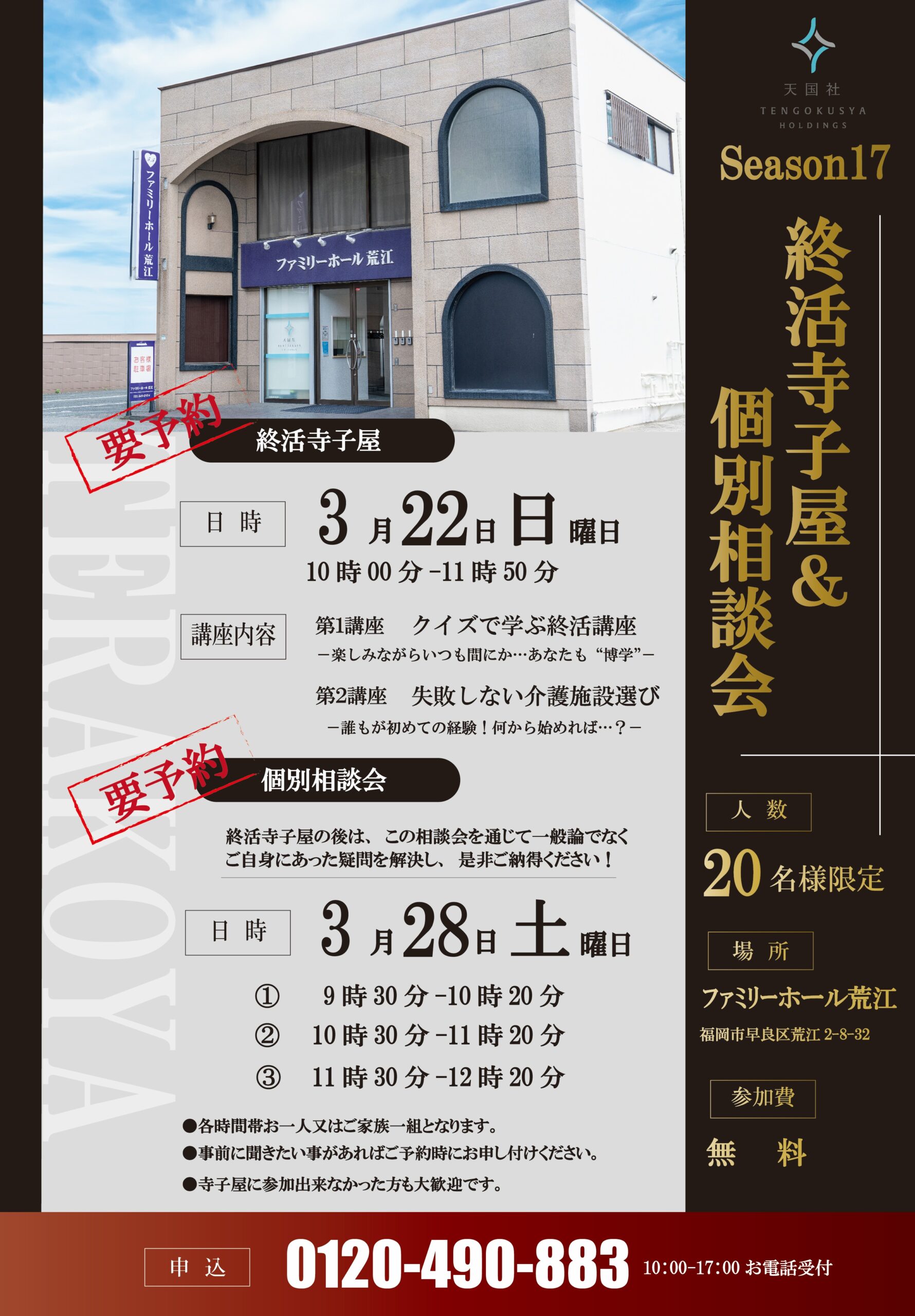 天国社からのお知らせ 福岡の葬儀社「天国社」 天国社からのお知らせ お知らせ 終活寺子屋&個別相談会 ファミリーホール荒江 終活寺子屋&個別相談会 ファミリーホール荒江 2026.02.22 お知らせ ファミリーホール荒江、各日程において終活寺子屋&個別相談会を開催致します。 終活寺子屋 3月22日 (日) 10時~11時50分 ☆人数:20名様限定 参加費:無料 ◎第一講座 クイズで学ぶ終活講座楽しみながらいつの間にか…あなたも”博学” ◎第二講座 失敗しない介護施設選び誰もが初めての経験!何から始めれば 個別相談会 3 月28日(土) ①9時30分~10時20分 ②10時30分~11時20分 ③11時30分~12時20分 ☆人数:各時間帯1組限定 参加費:無料 終活寺子屋の後は、この相談会を通じて一般論でなくご自身にあった疑問を解決し、ぜひご納得ください! ※●各時間帯お一人又はご家族一組になります。●事前に聞きたい事があればご予約時にお申し付けください。●寺子屋に差なんか出来なかった方も大歓迎です。 皆様のご参加心よりお待ちしております。 些細と思われる事も、お気軽にご連絡ください。 24時間365日対応・通話無料 電話をかける メールでご相談 無料資料請求 戻る カテゴリー 新着情報 お知らせ イベント情報 葬儀の知識 福岡の葬儀情報 家族葬について お客様の声 ご葬儀事例一覧 年別アーカイブ 2026年 2025年 2024年 2023年 2022年 2021年