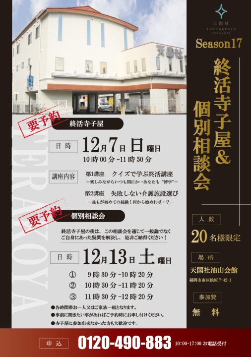 天国社からのお知らせ 福岡の葬儀社「天国社」 天国社からのお知らせ お知らせ 油山会館で終活寺子屋が行われました 油山会館で終活寺子屋が行われました 2025.12.07 お知らせ 12月7日、油山会館で終活寺子屋を行われました。 第1講座 クイズで学ぶ終活講座 ~楽しみながらいつの間にかあなたも博学~ 第2講座 失敗しない介護施設選び~誰もが初めての経験!何から始めれば…?~ 当日は、多くの方にご参加いただきました。次回、12月13日土曜日には、個別相談会を開催致します。要予約となっておりますのでお急ぎください。 些細と思われる事も、お気軽にご連絡ください。 24時間365日対応・通話無料 電話をかける メールでご相談 無料資料請求 戻る カテゴリー 新着情報 お知らせ イベント情報 葬儀の知識 福岡の葬儀情報 家族葬について お客様の声 ご葬儀事例一覧 年別アーカイブ 2025年 2024年 2023年 2022年 2021年