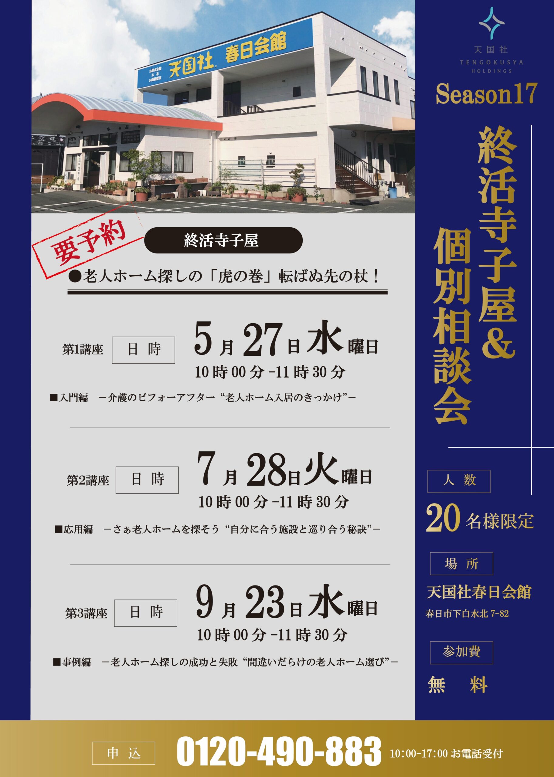 天国社からのお知らせ 福岡の葬儀社「天国社」 天国社からのお知らせ お知らせ 春日会館終活寺子屋&個別相談会を開催致します 春日会館終活寺子屋&個別相談会を開催致します 2026.04.17 お知らせ 春日会館にて、終活寺子屋を実施致します。 今回のタイトルは「老人ホーム探しの「虎の巻」転ばぬ先の杖!」 スケジュールはこちら! ◎第1講座 5月27日 水曜日 10時~11時30分 ◇入門編 -介護のビフォーアフター“老人ホーム入居のきっかけ”- ◎第2講座7月28日火曜日10時~11時30分 ♢-さぁ老人ホームを探そう“自分に合う施設と巡り合う秘訣”- ◎第3講座9月23日水曜日10時~11時30分 ♢事例編-老人ホーム探しの成功と失敗“間違いだらけの老人ホーム選び”- 20名様限定 参加費無料のイベントとなっております。皆様、このイベントをきっかけに終活の事を相談してみませんか? 要予約となっておりますのでお気を付けください。 皆様のご参加をスタッフ一同、心よりお待ち申しあげております。 些細と思われる事も、お気軽にご連絡ください。 24時間365日対応・通話無料 電話をかける メールでご相談 無料資料請求 戻る カテゴリー 新着情報 お知らせ イベント情報 葬儀の知識 福岡の葬儀情報 家族葬について お客様の声 ご葬儀事例一覧 年別アーカイブ 2026年 2025年 2024年 2023年 2022年 2021年