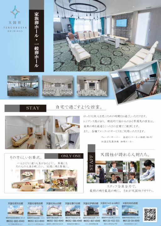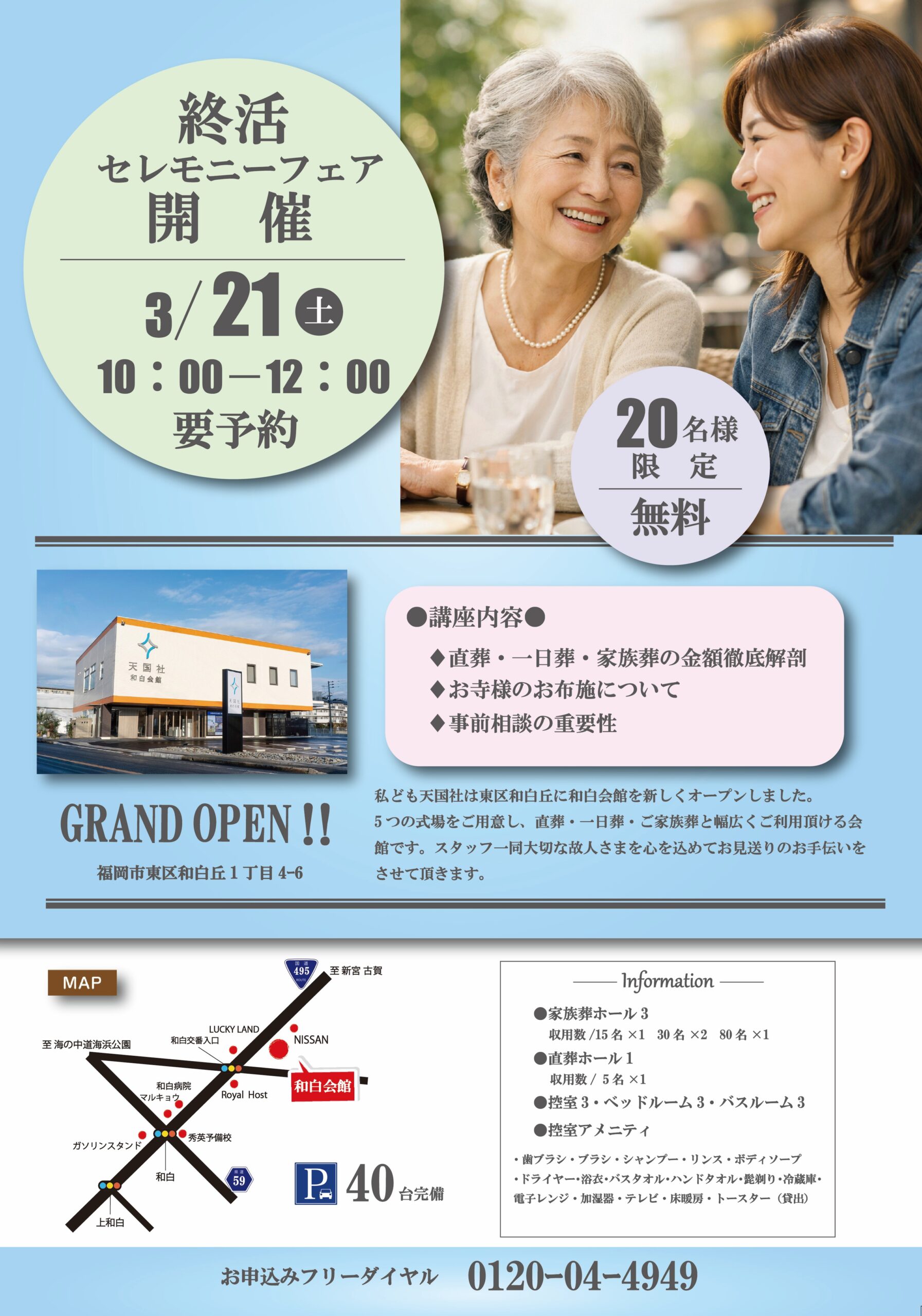 天国社からのお知らせ 福岡の葬儀社「天国社」 天国社からのお知らせ お知らせ 終活セレモニーフェア開催 終活セレモニーフェア開催 2026.03.13 お知らせ 3月21日土曜日10時~12時まで、和白会館において「終活セレモニーフェア」を開催致します。 講座の内容 ◎直葬・一日葬・家族葬の金額徹底解剖 ◎お寺様のお布施について ◎事前相談の重要性 20名様限定(無料) 要予約のイベントとなっておりますので参加ご希望の方はお電話にてお早めにお申し込みください。 些細と思われる事も、お気軽にご連絡ください。 24時間365日対応・通話無料 電話をかける メールでご相談 無料資料請求 戻る カテゴリー 新着情報 お知らせ イベント情報 葬儀の知識 福岡の葬儀情報 家族葬について お客様の声 ご葬儀事例一覧 年別アーカイブ 2026年 2025年 2024年 2023年 2022年 2021年