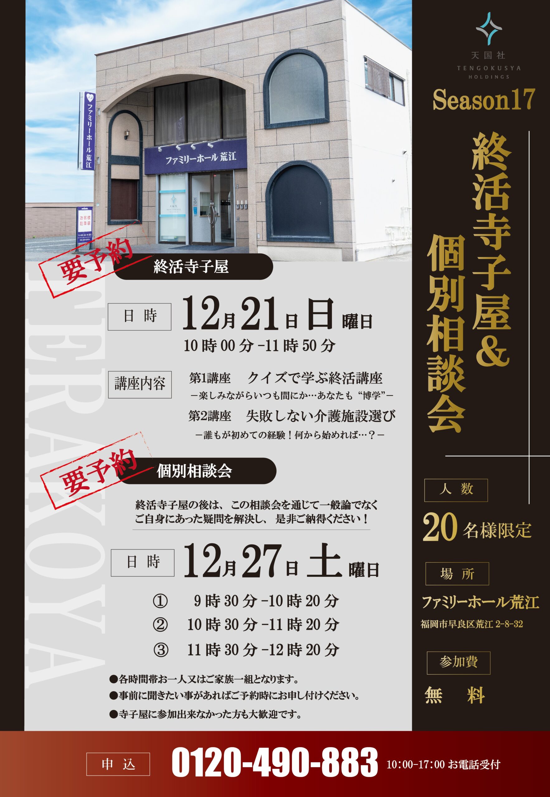 天国社からのお知らせ 福岡の葬儀社「天国社」 天国社からのお知らせ お知らせ 終活寺子屋&個別相談会 ファミリーホール荒江 終活寺子屋&個別相談会 ファミリーホール荒江 2025.11.10 お知らせ ファミリーホール荒江、各日程において終活寺子屋&個別相談会を開催致します。 終活寺子屋 12月21日 (日) 10時~11時50分 ☆人数:20名様限定 参加費:無料 ◎第一講座 クイズで学ぶ終活講座楽しみながらいつの間にか…あなたも”博学” ◎第二講座 失敗しない介護施設選び誰もが初めての経験!何から始めれば 個別相談会 12月27日(土) ①9時30分~10時20分 ②10時30分~11時20分 ③11時30分~12時20分 ☆人数:各時間帯1組限定 参加費:無料 終活寺子屋の後は、この相談会を通じて一般論でなくご自身にあった疑問を解決し、ぜひご納得ください! ※●各時間帯お一人又はご家族一組になります。●事前に聞きたい事があればご予約時にお申し付けください。●寺子屋に差なんか出来なかった方も大歓迎です。 皆様のご参加心よりお待ちしております。 些細と思われる事も、お気軽にご連絡ください。 24時間365日対応・通話無料 電話をかける メールでご相談 無料資料請求 戻る カテゴリー 新着情報 お知らせ イベント情報 葬儀の知識 福岡の葬儀情報 家族葬について お客様の声 ご葬儀事例一覧 年別アーカイブ 2025年 2024年 2023年 2022年 2021年