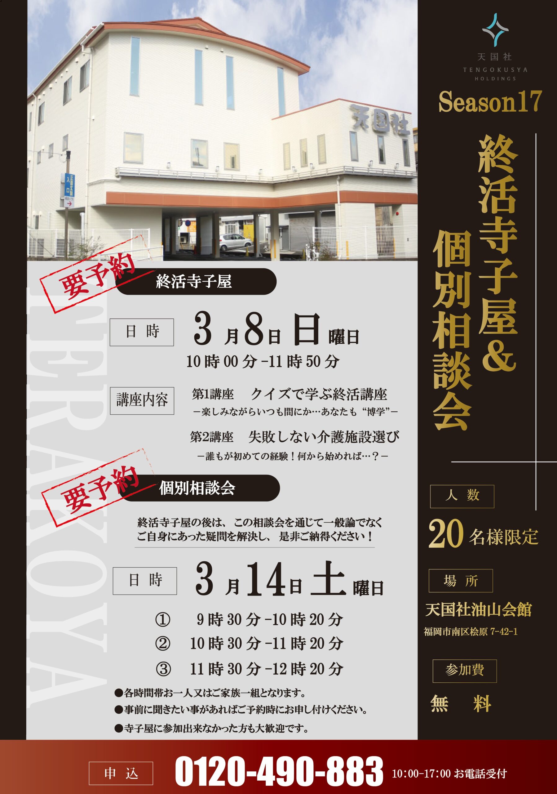 天国社からのお知らせ 福岡の葬儀社「天国社」 天国社からのお知らせ お知らせ 終活寺子屋&個別相談会 油山会館 終活寺子屋&個別相談会 油山会館 2026.02.08 お知らせ 油山会館、各日程において終活寺子屋&個別相談会を開催致します。 終活寺子屋 3月8日 (日) 10時~11時50分 ☆人数:20名様限定 参加費:無料 ◎第一講座 クイズで学ぶ終活講座楽しみながらいつの間にか…あなたも”博学” ◎第二講座 失敗しない介護施設選び誰もが初めての経験!何から始めれば 個別相談会 3 月14日(土) ①9時30分~10時20分 ②10時30分~11時20分 ③11時30分~12時20分 ☆人数:各時間帯1組限定 参加費:無料 終活寺子屋の後は、この相談会を通じて一般論でなくご自身にあった疑問を解決し、ぜひご納得ください! ※●各時間帯お一人又はご家族一組になります。●事前に聞きたい事があればご予約時にお申し付けください。●寺子屋に差なんか出来なかった方も大歓迎です。 皆様のご参加心よりお待ちしております。 些細と思われる事も、お気軽にご連絡ください。 24時間365日対応・通話無料 電話をかける メールでご相談 無料資料請求 戻る カテゴリー 新着情報 お知らせ イベント情報 葬儀の知識 福岡の葬儀情報 家族葬について お客様の声 ご葬儀事例一覧 年別アーカイブ 2026年 2025年 2024年 2023年 2022年 2021年
